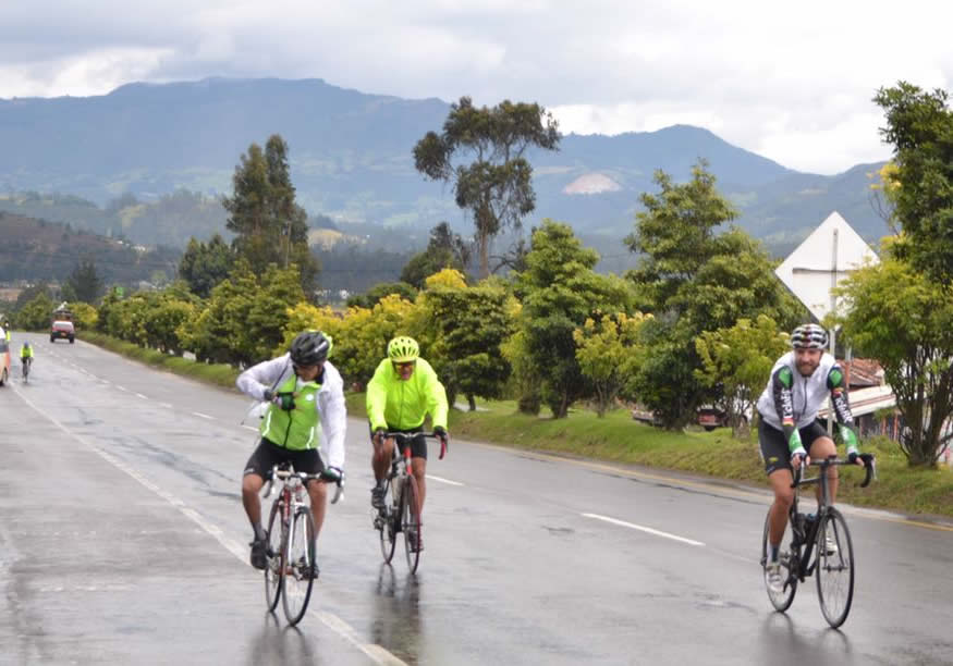 En adelante la llovizna fue una compañera iba y volvía, pero ya nos importaba, nos tenía sin cuidado, ¿qué más daba otra mojada?. Pasando Tocancipá paró la rociaderita y pudimos ver al sol por allá arriba haciendo “coquitos” en medio de algunas nubes grises, bienvenido el calorcito, ya lo extrañaban nuestras entumidas piernas, era la energia que necesitábamos para atacar El Sisga. Pensamos que los cuatro pasajeros de Camilo comenzarían a sentir remordimiento y nos acompañarían en la subida, pero los vimos tranquilos y muy entretenidos viendo como sus compañeros luchaban entre sí por coronar de primeros la cuestica que se aparece al pasar el peaje.