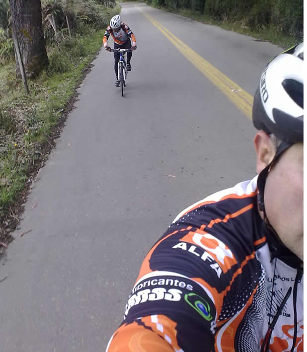 Bueno, con un muy buen clima y en nuestras bicicletas de todoterreno iniciamos nuestro recorrido, en la ruta de ida llegando al Alto de las Arepas un sonoro grito de ánimo nos reconfortó, era nuestro amigo y colega Alfredo Galvis, me imagino que la expresión fue motivada al ver que las camisetas que copatrocinó cumplían su propósito publicitario.